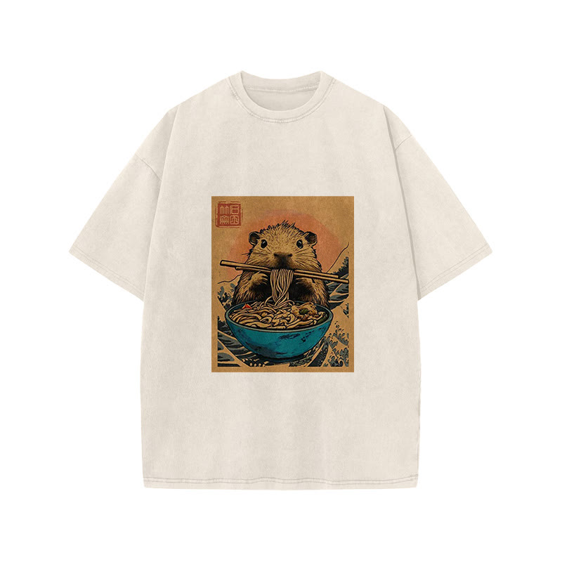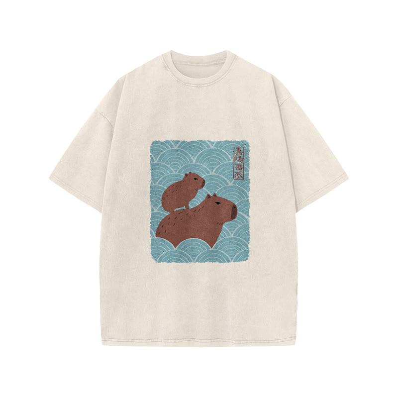 Unisex Japanese Capybara Waves Print Acid Washed T-shirt