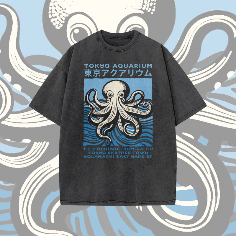 Unisex Tokyo Aquarium Print Acid Washed T-shirt