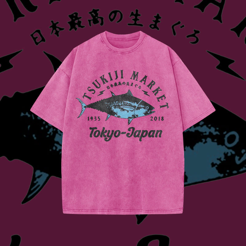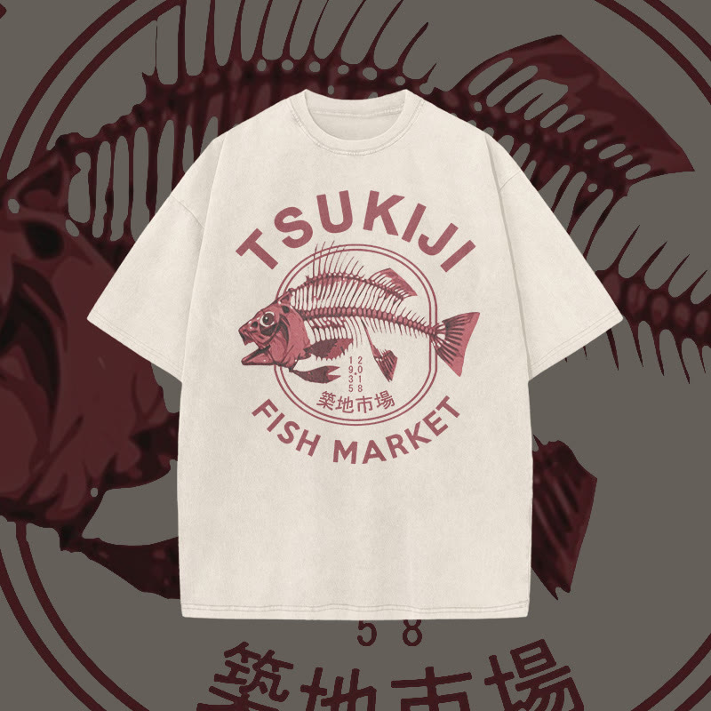 Unisex Tsukiji Market Print Acid Washed Causal T-shirt
