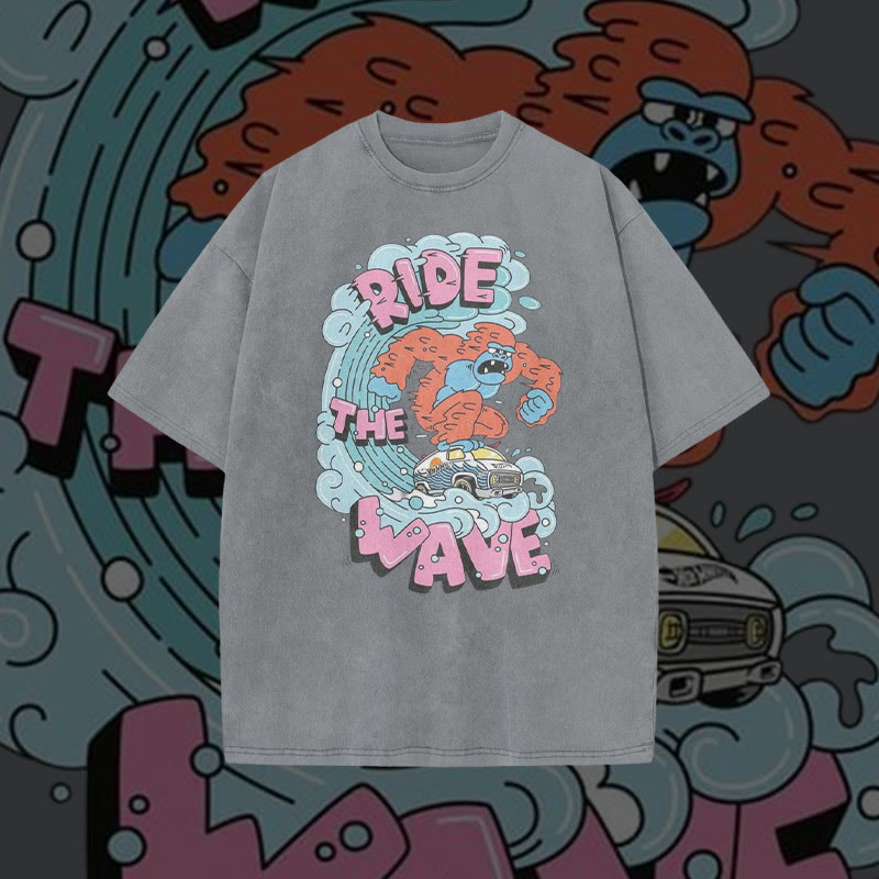 Unisex Ride The Wave Print Acid Washed T-shirt