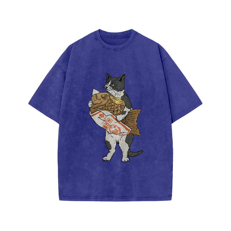 Unisex Cow Cat Holding Taiyaki Print Acid Washed T-shirt