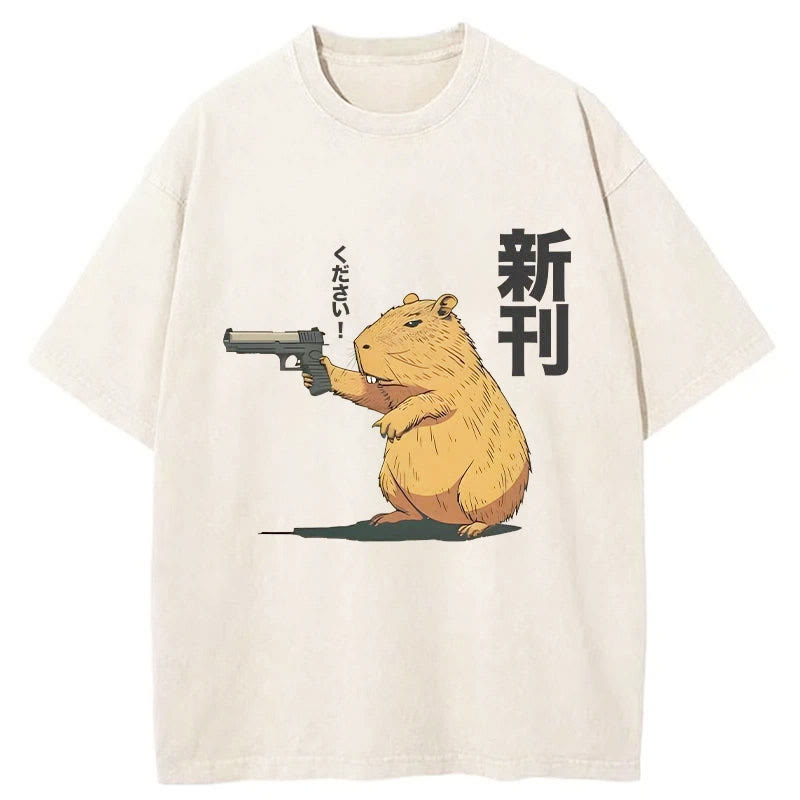 Unisex Capybara Holding A Gun Print Acid Washed T-shirt