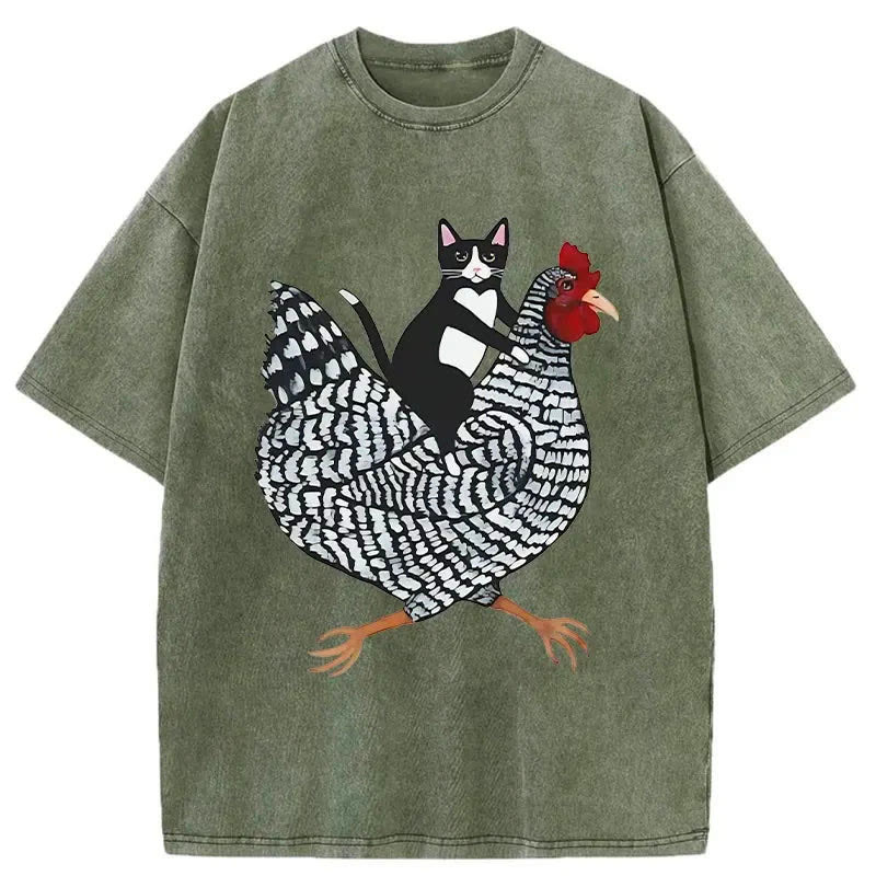 Unisex Cat Riding Chicken Funny Print Acid Washed T-shirt