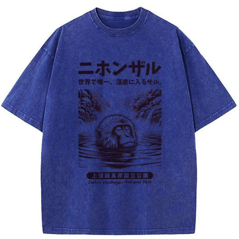 Unisex Macaque Monkey Hot Spring Print Acid Washed T-shirt