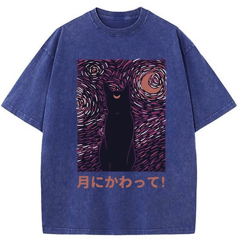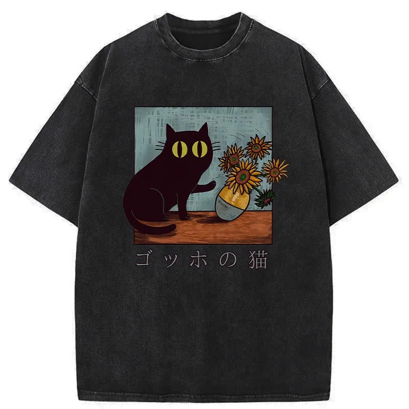 Unisex Van Gogh's Cat Print Acid Washed T-shirt