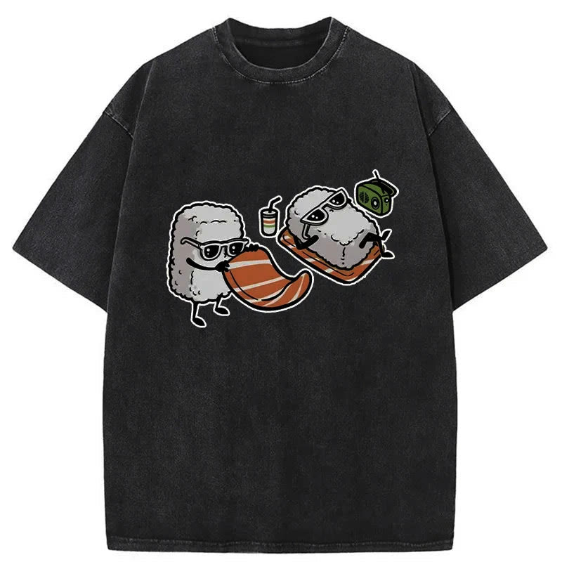 Unisex Sunbathing Sushi Print Acid Washed T-shirt