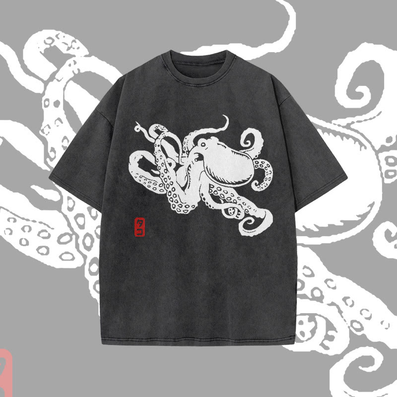 Unisex Octopus Japanese Print Acid Washed T-shirt