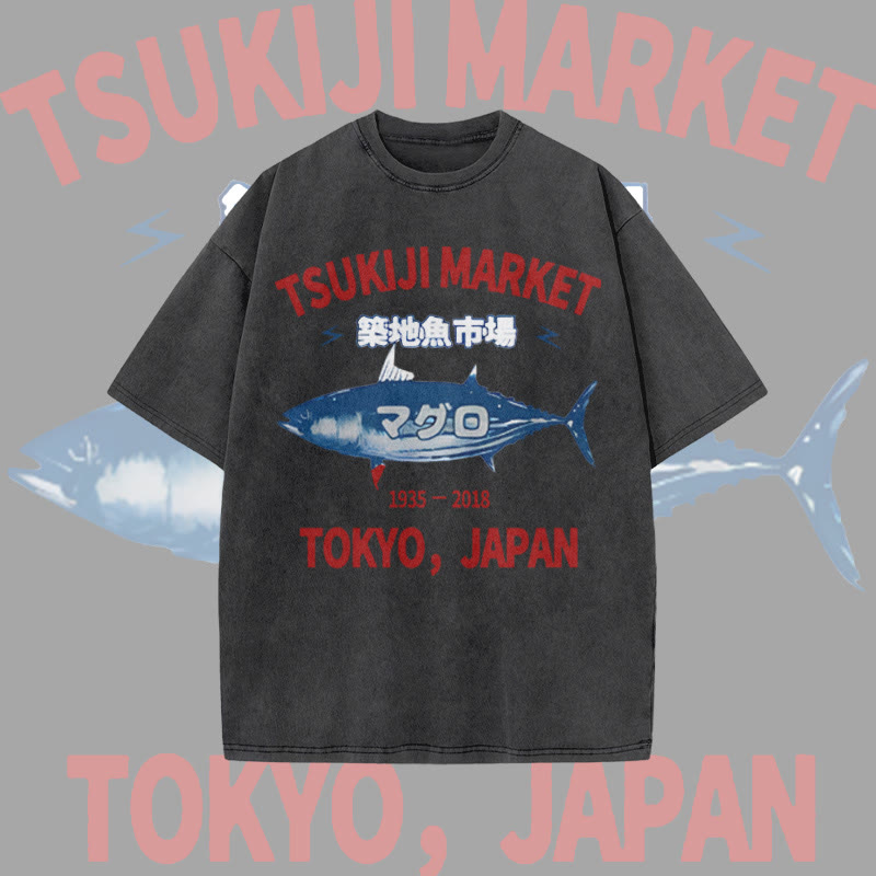 Unisex Tsukiji Market Print Acid Washed T-shirt