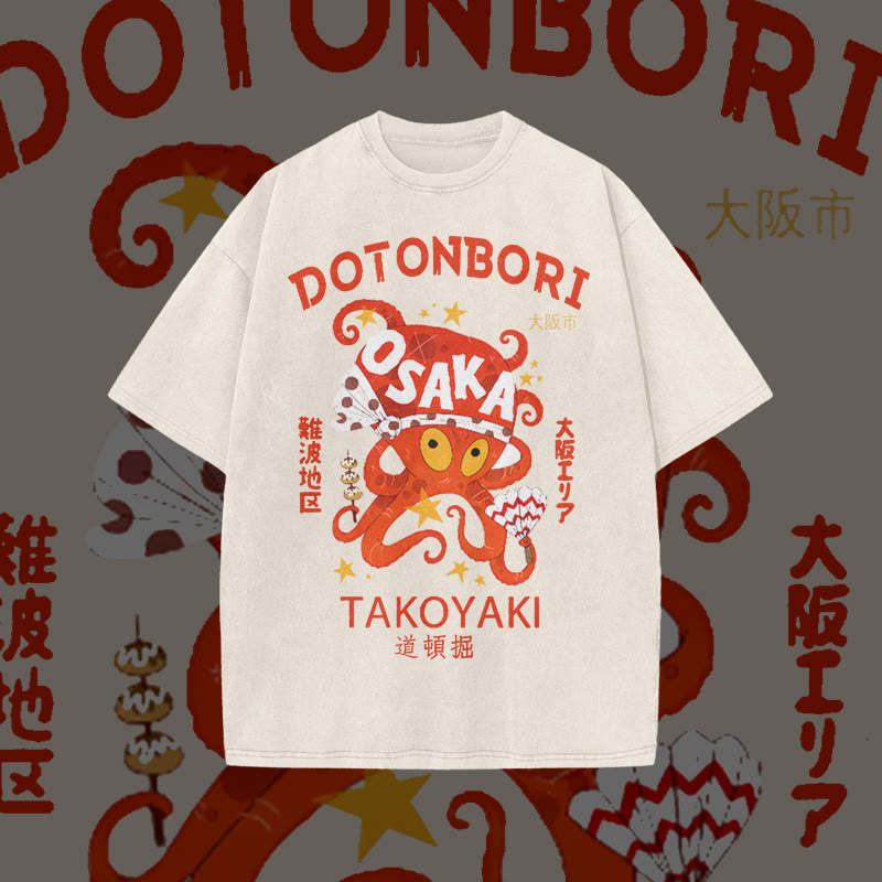 Unisex Osaka Dotonbori Octopus Print Acid Washed T-shirt