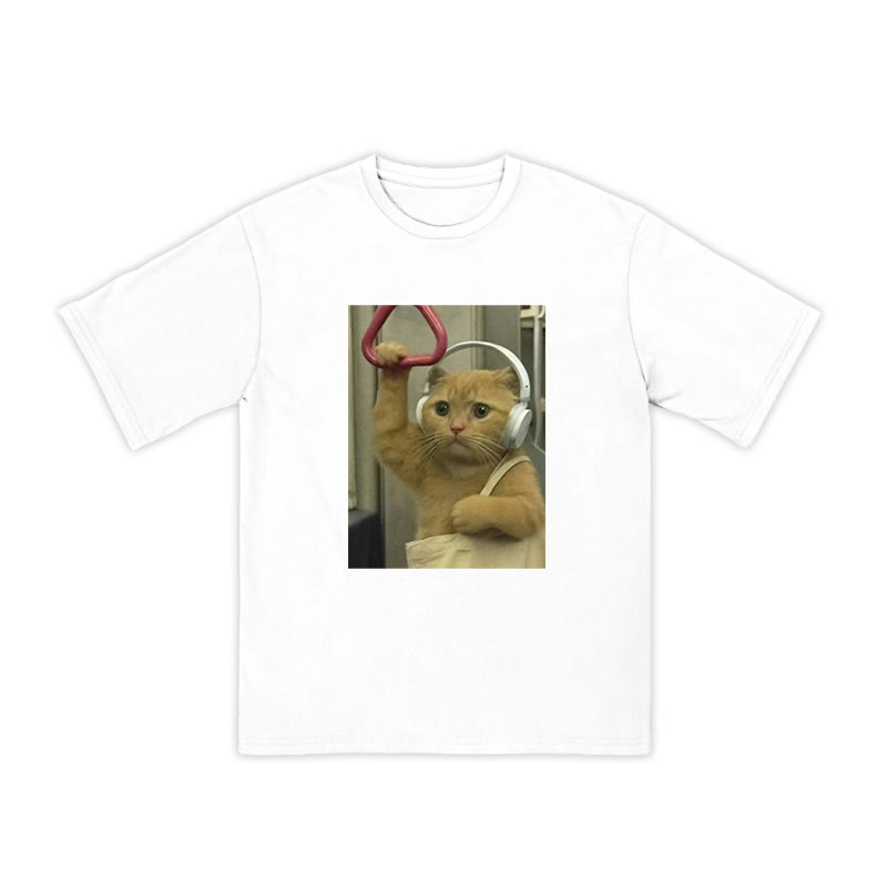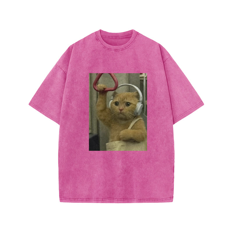 Unisex Cat Riding The Subway Print Acid Washed T-shirt