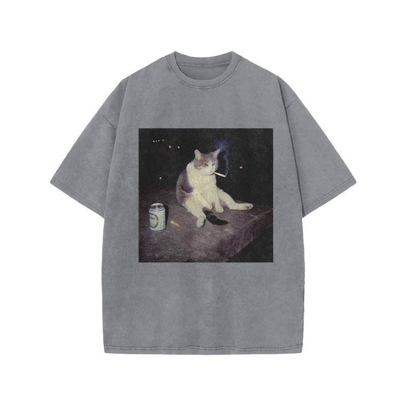 Unisex Smocking Cat Print Acid Washed T-shirt