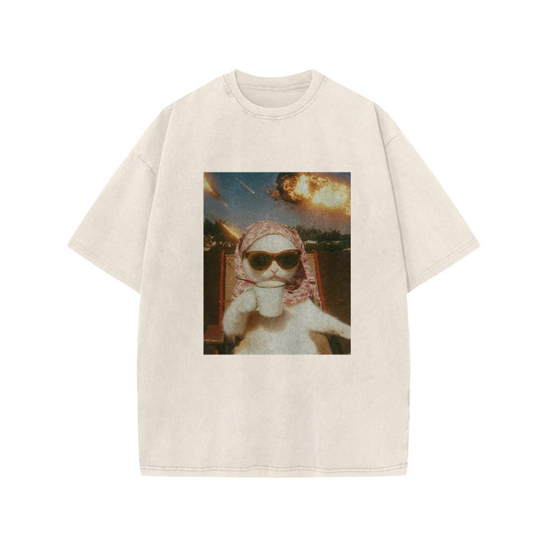 Unisex Funny Decadent Cats Print Acid Washed T-shirt