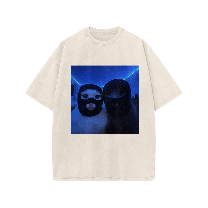 Unisex Cats Wearing Robber Mask Print Acid Washed T-shirt