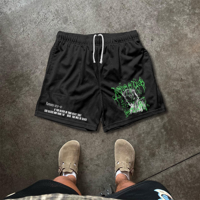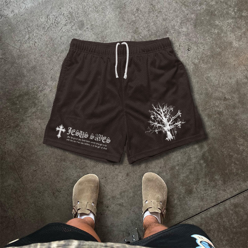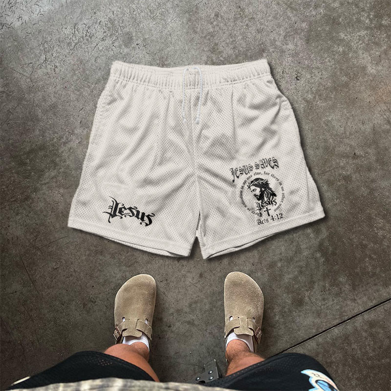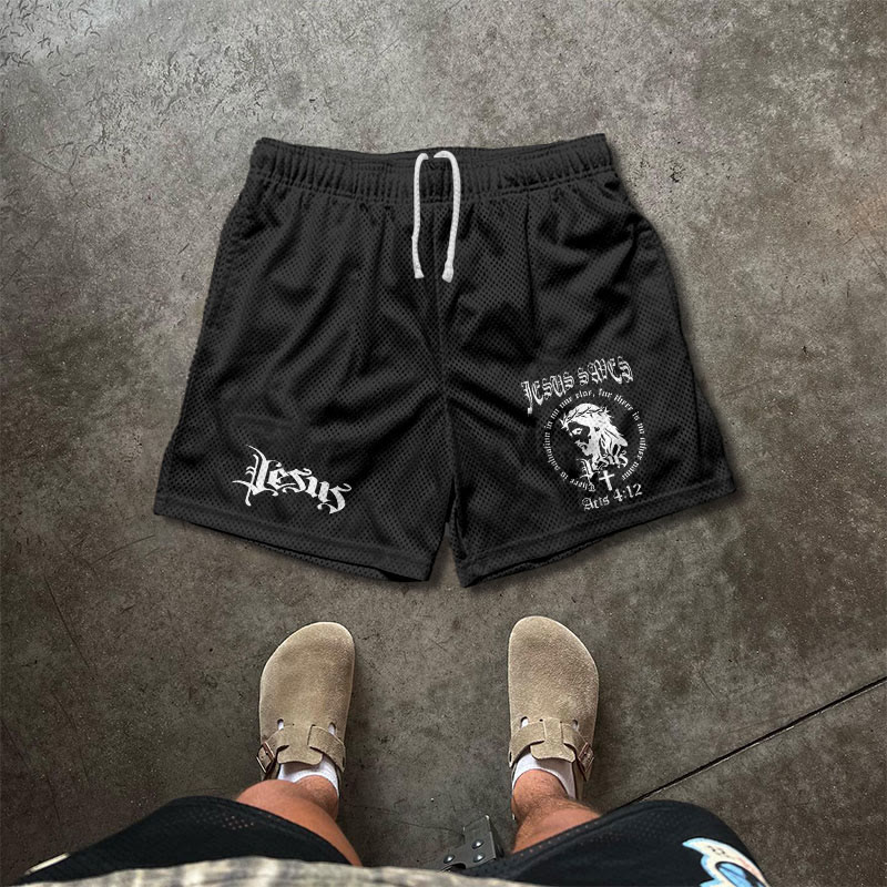 JESUS SAVES Print Causal Mesh Shorts