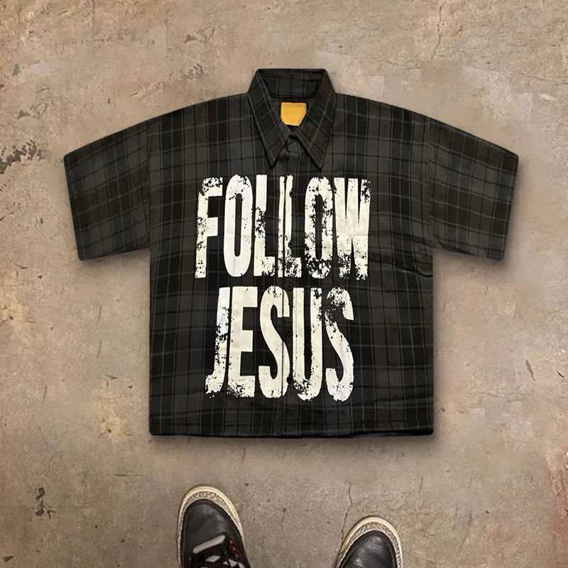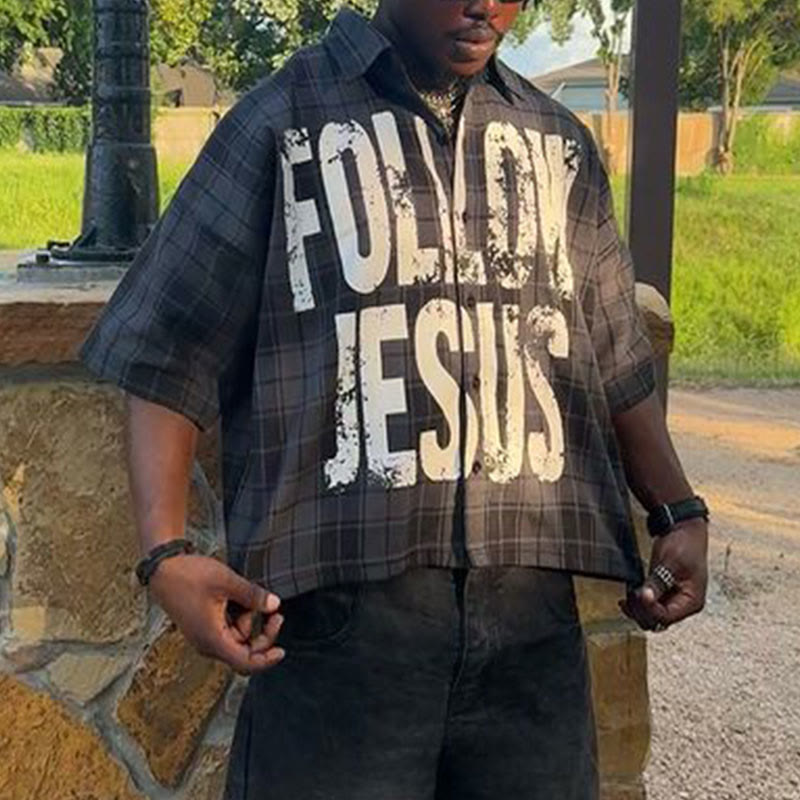 Men's Follow Jesus Classic Dark Grey Plaid Print Short Sleeve Shirt