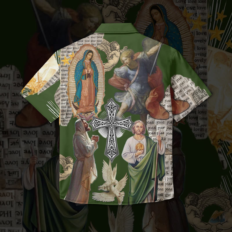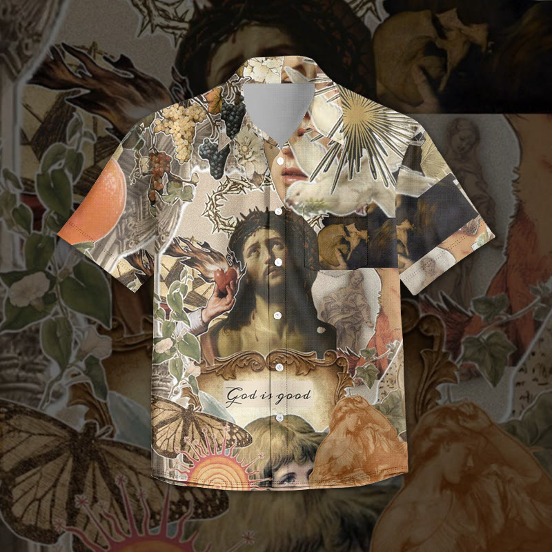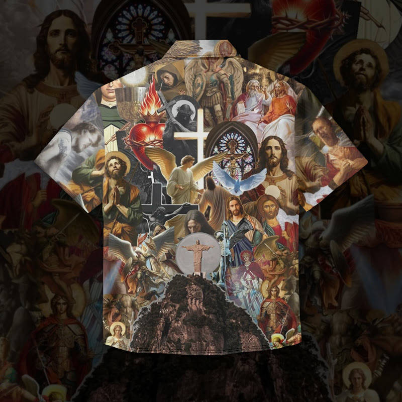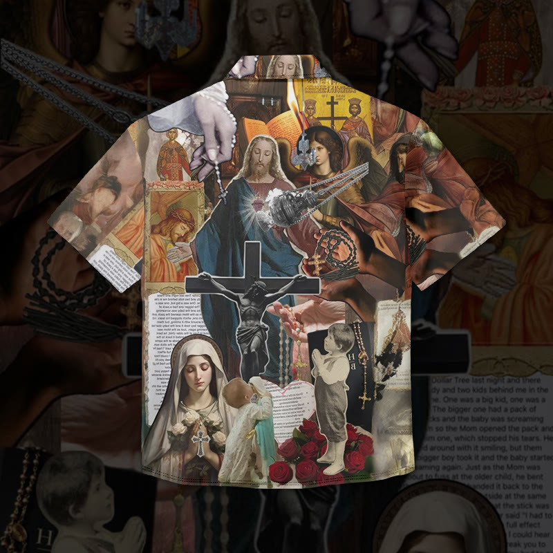 Jesus Splicing Illustration Print Short Sleeve Vintage Shirt