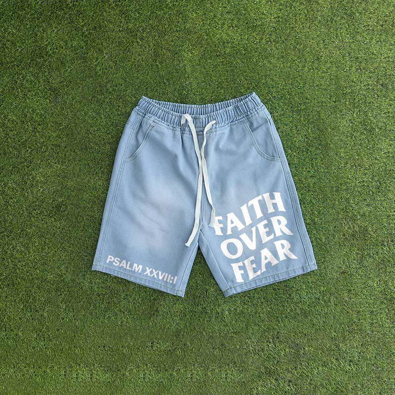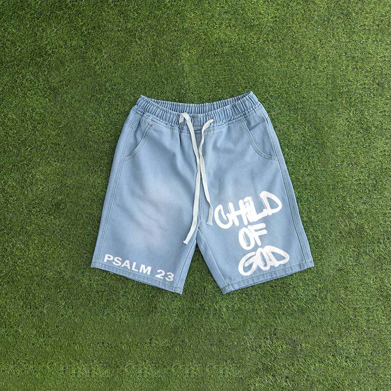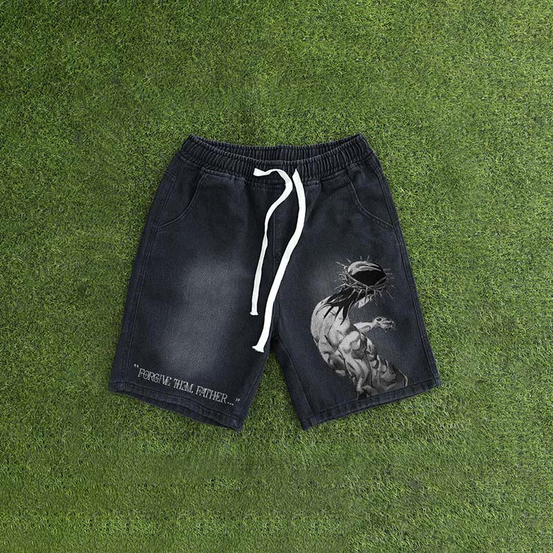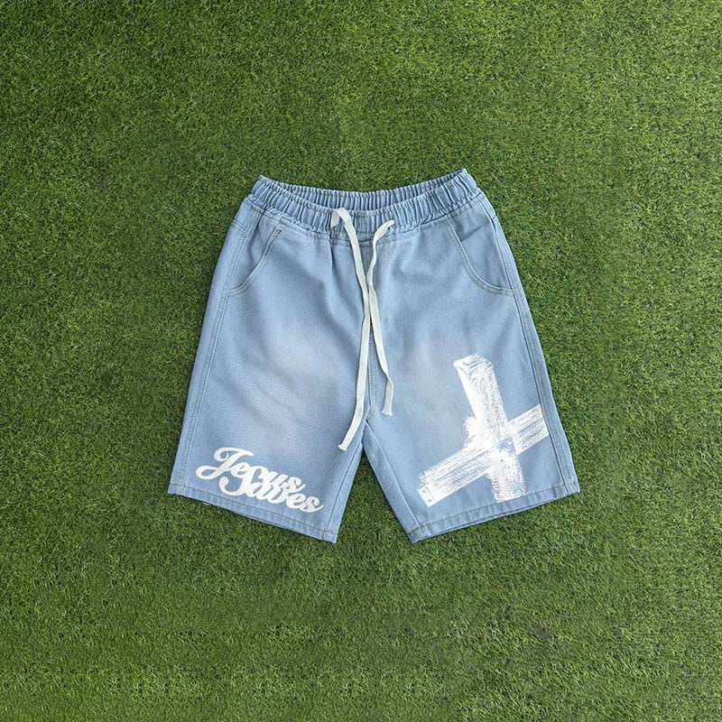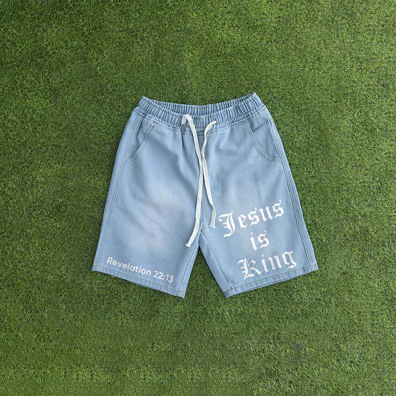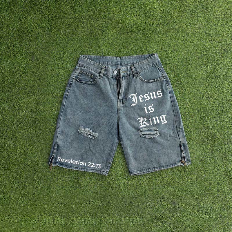 Jesus Is King Print Ripped Zipper Denim Shorts