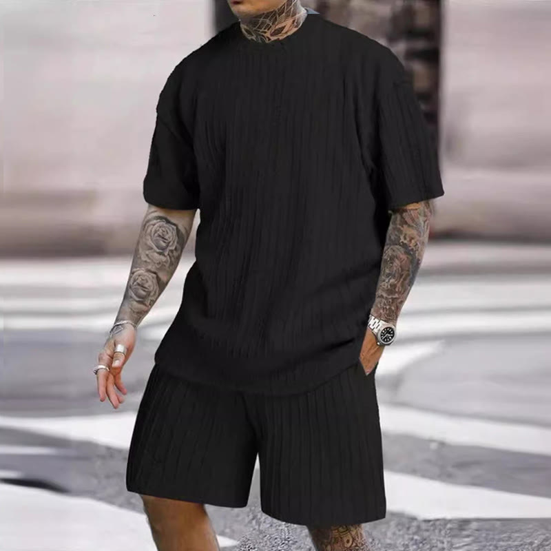 Solid Color Men's Knitted T-shirt Two-piece Set