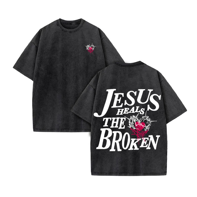 Unisex Jesus Heals The Broken Heart Print Acid Washed T-shirt