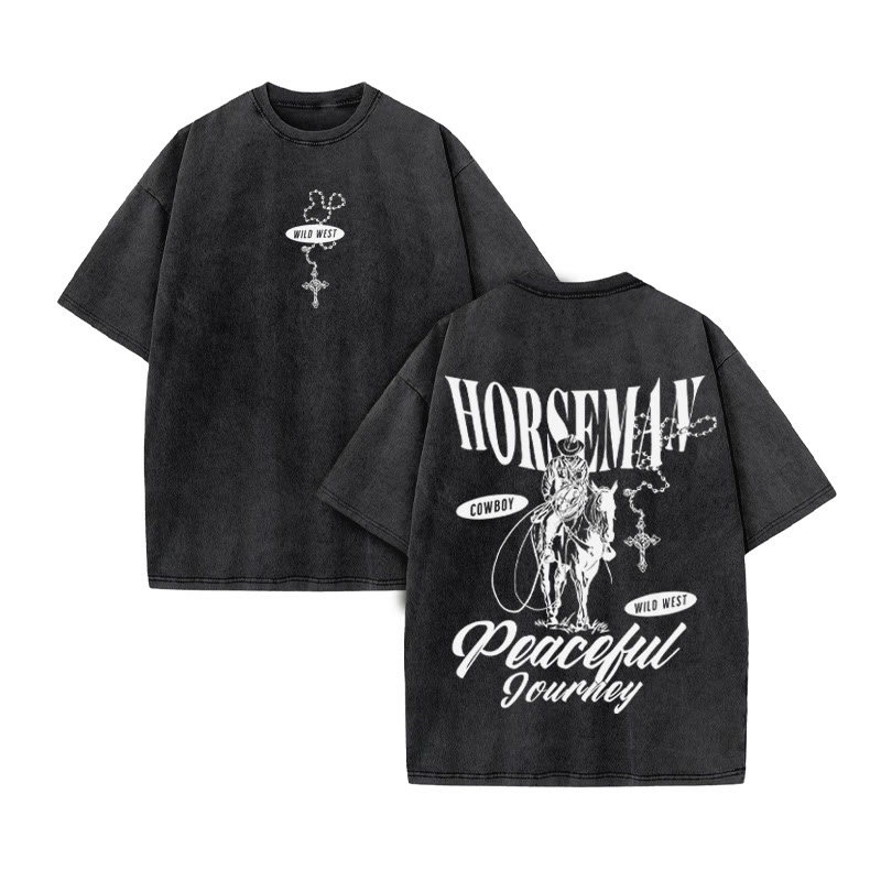 Unisex HORSEMAN Western Style Print Acid Washed T-shirt