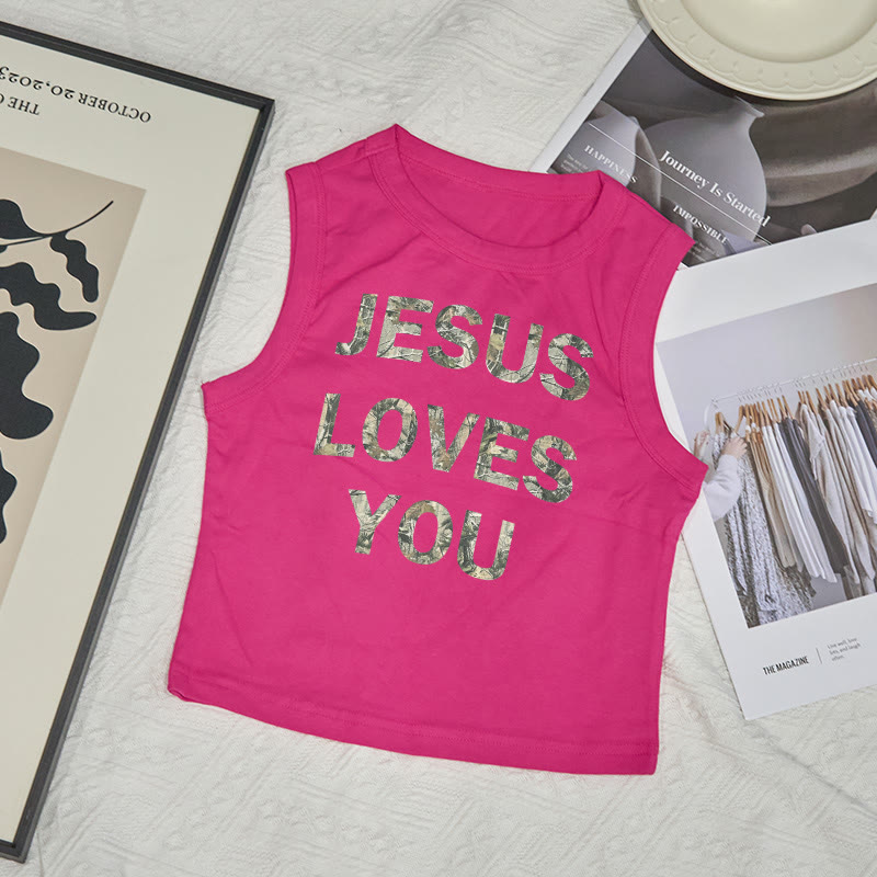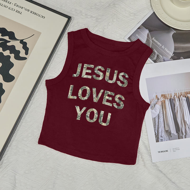 Dead Leaves Camouflage Jesus Loves You Print Sleeveless Tank Top