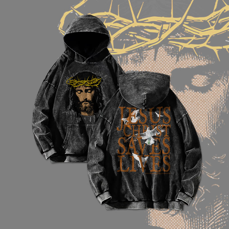 Jesus Face Print Acid Washed Hoodie