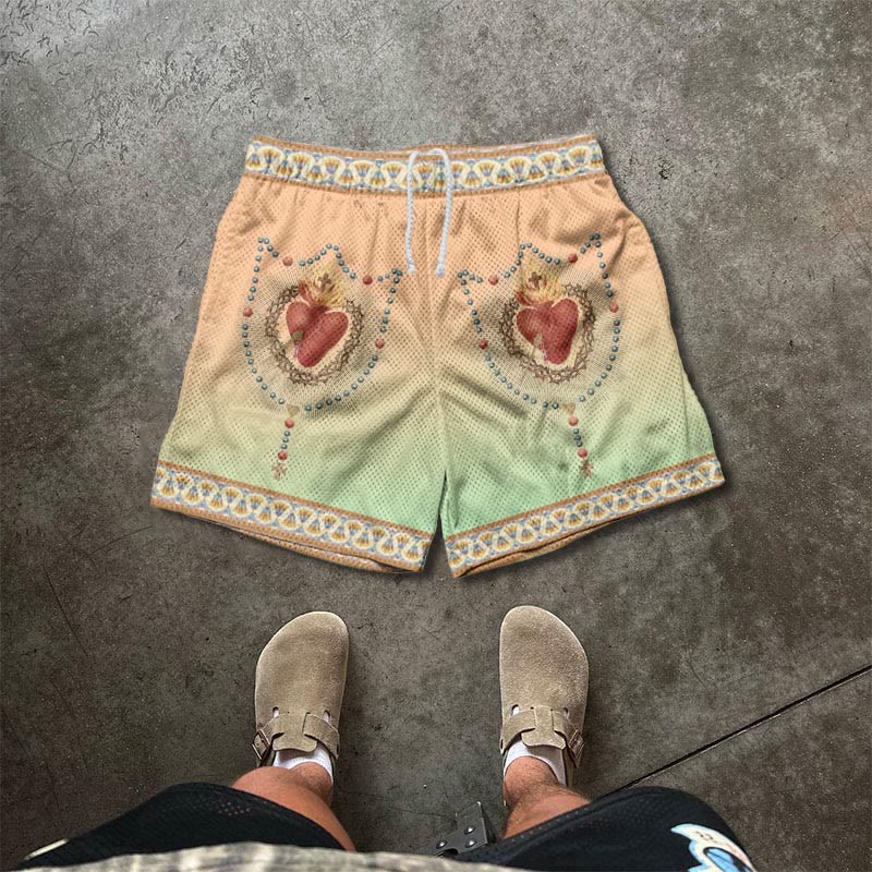 Ombre Contrasting Cross Heart Print Mesh Casual Shorts