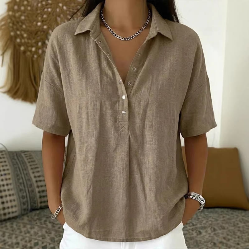 Simple Cozy Solid-color Button-up Short-sleeve Polo Blouse