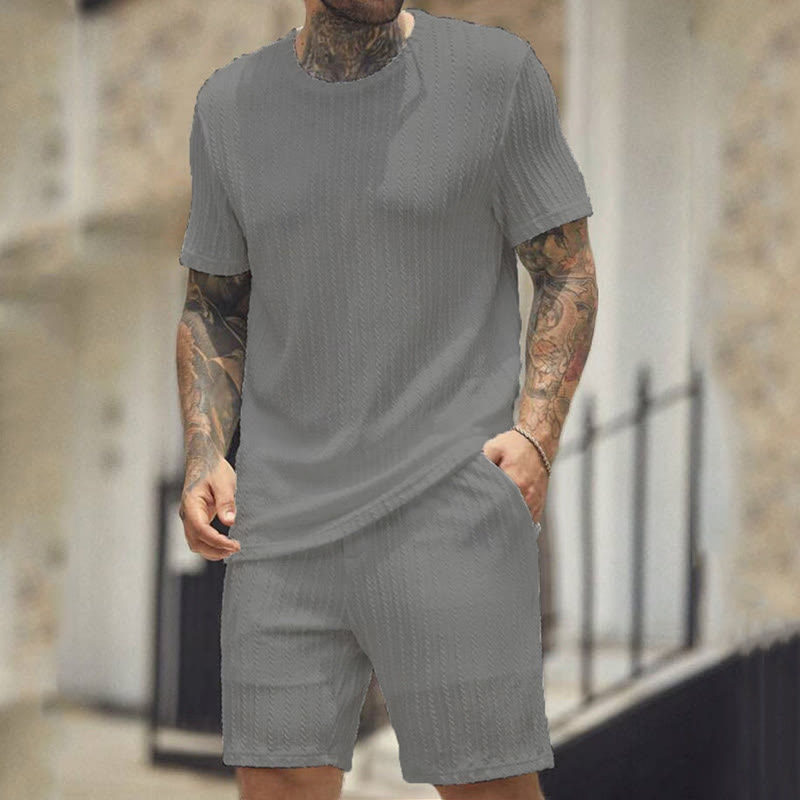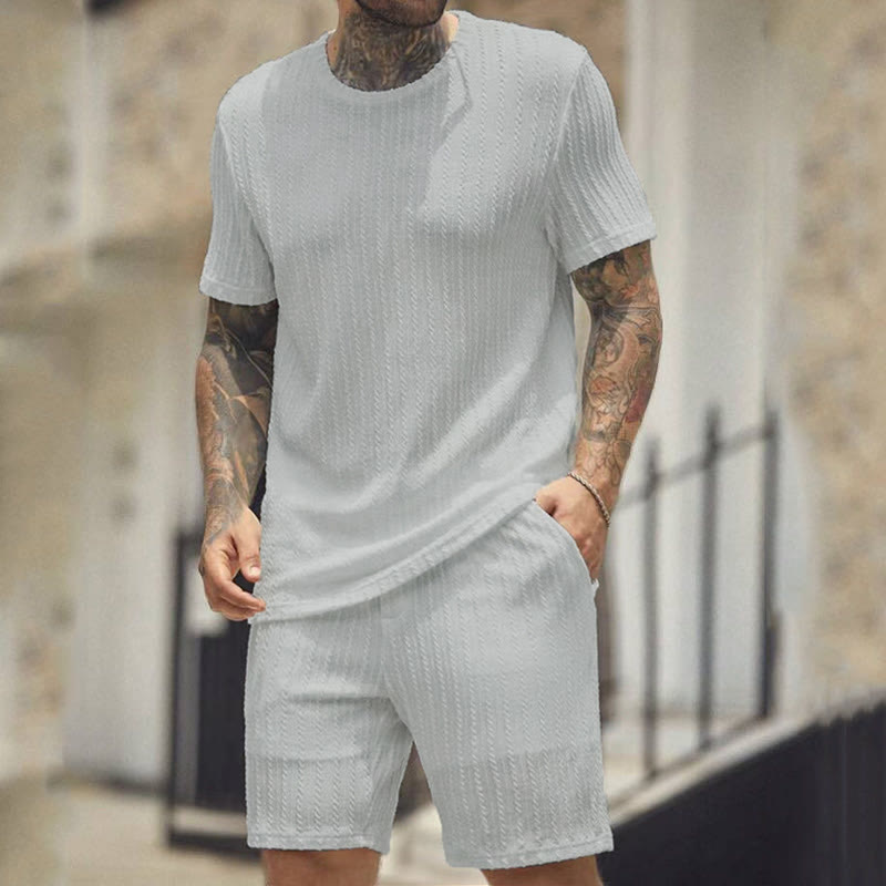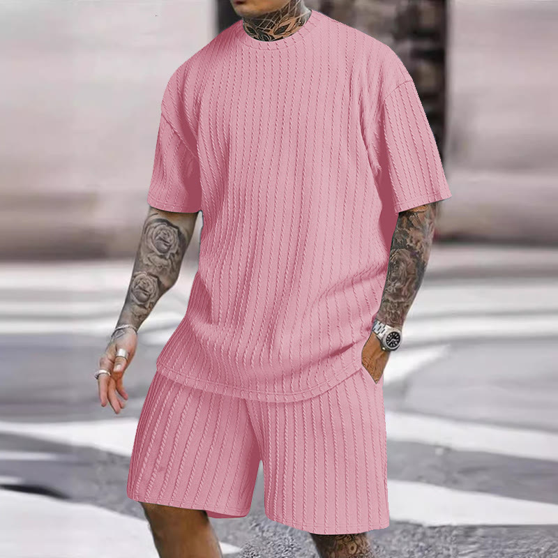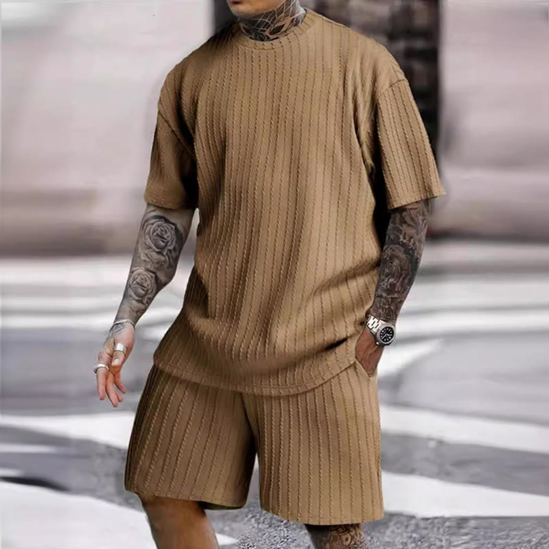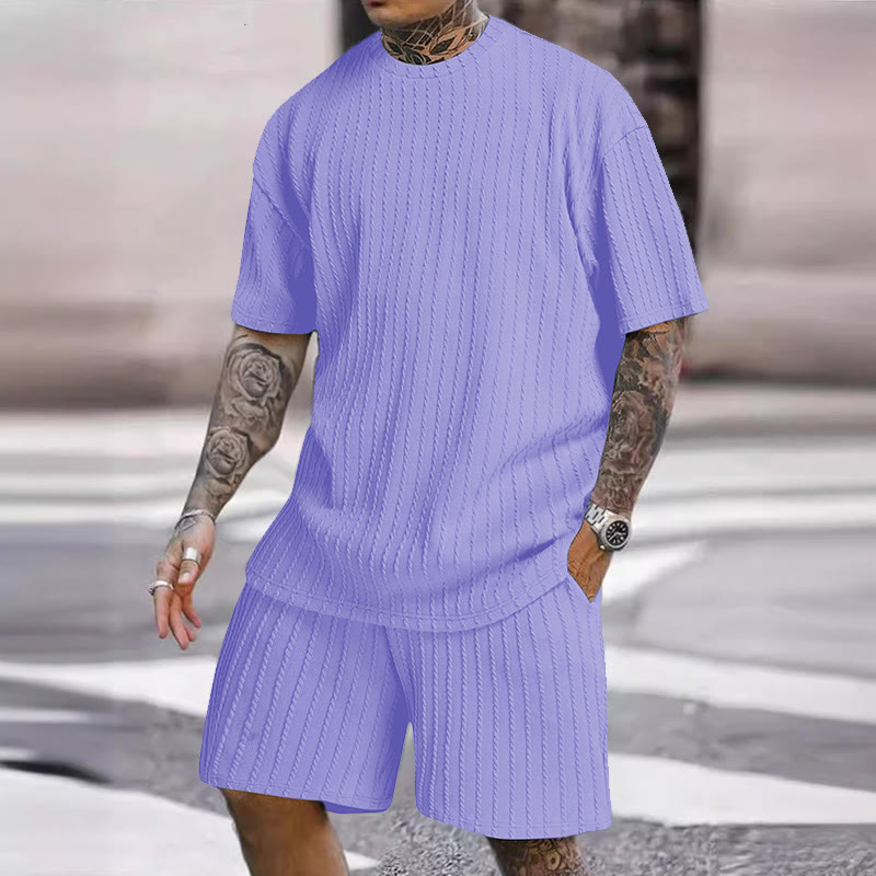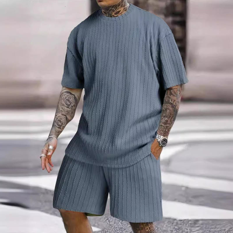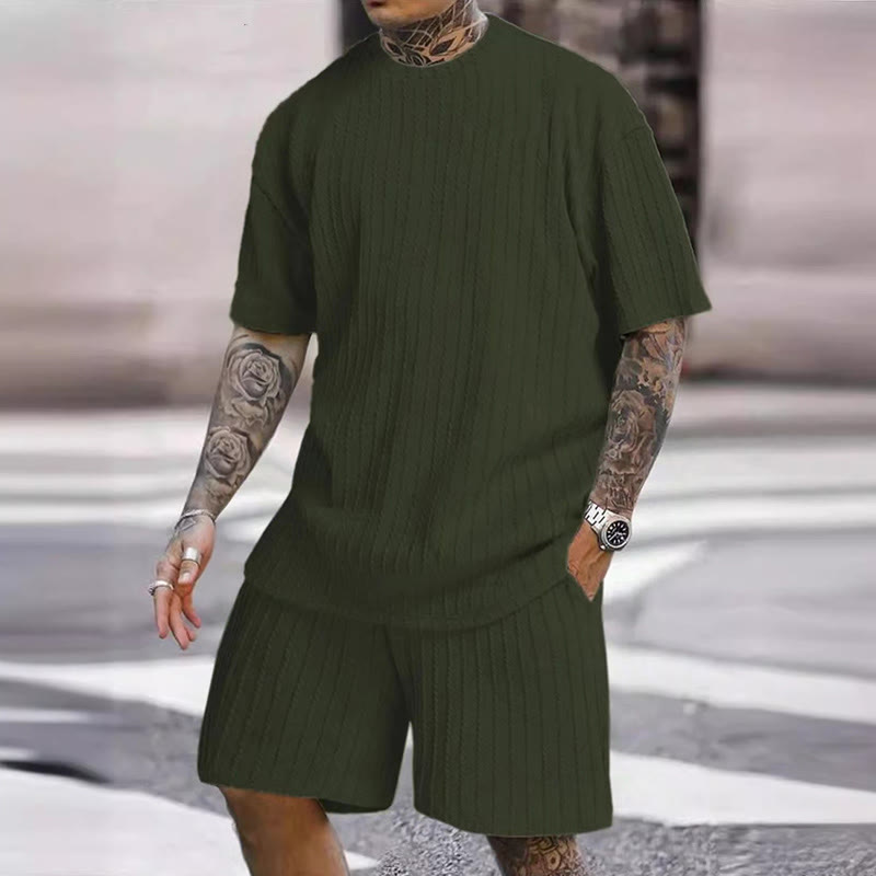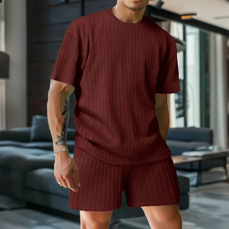 Solid Color Men's Knitted T-shirt Two-piece Set