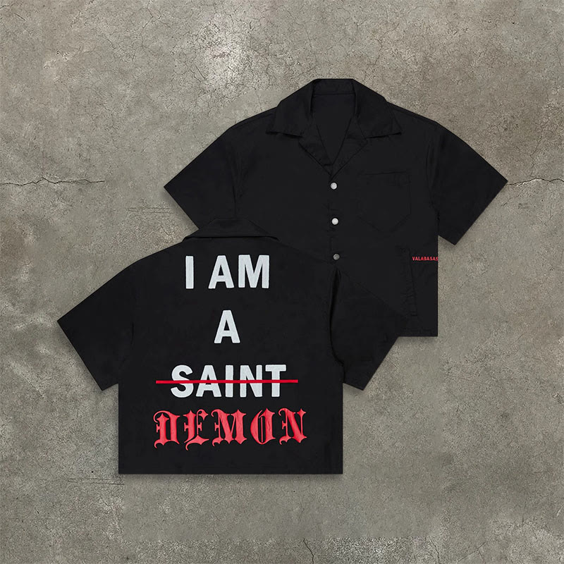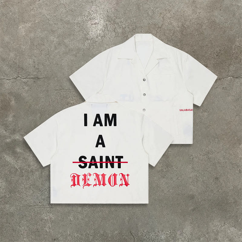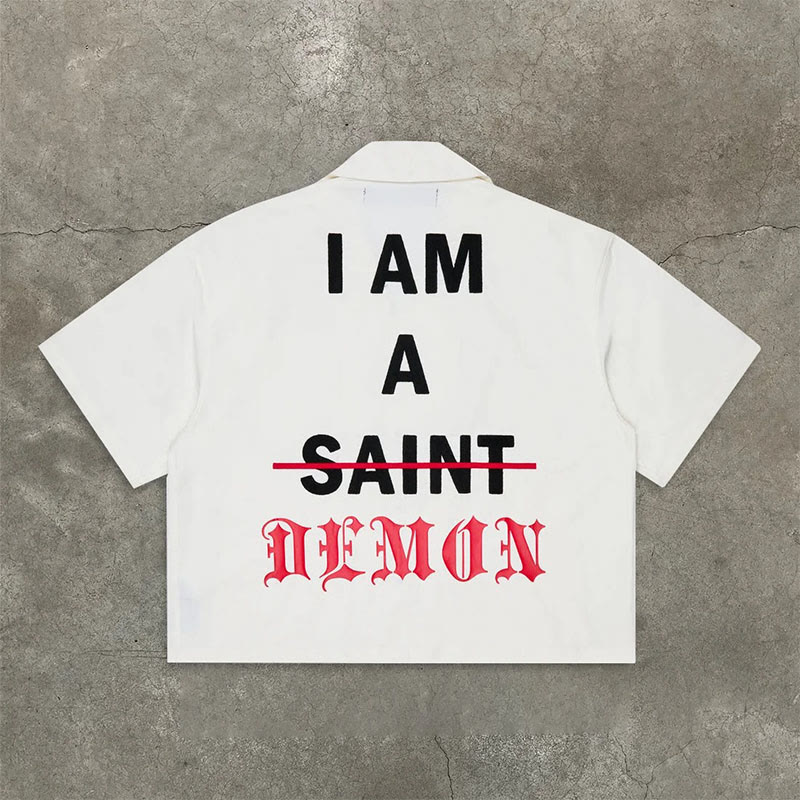 Street Style I Am A Demon Print Cuban Collar Short-sleeved Shirt
