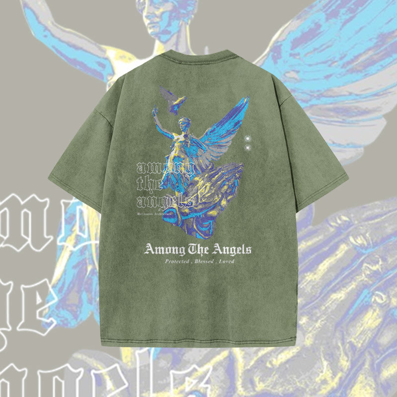 Unisex Among The Angels Print Acid Washed T-shirt