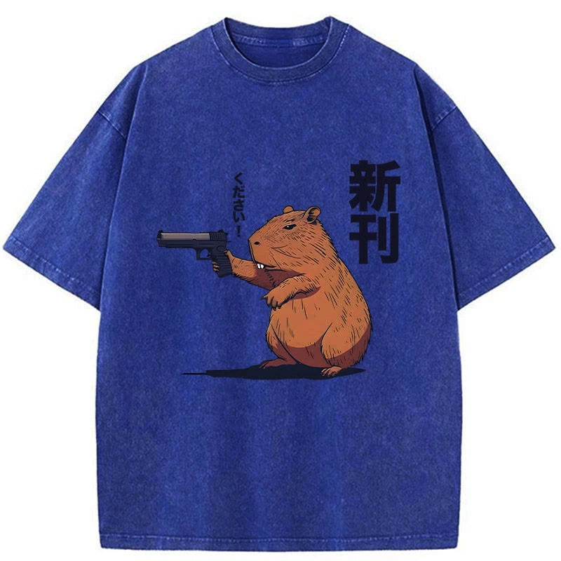 Unisex Capybara Holding A Gun Print Acid Washed T-shirt
