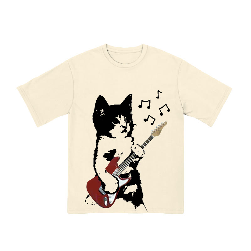 Unisex 100% Cotton Cat Playing Electric Guitar Print T-shirt - Apricot - US16-18(2XL) - image 3