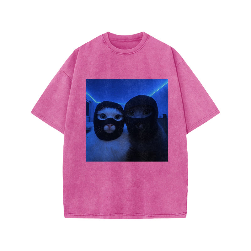 Unisex Cats Wearing Robber Mask Print Acid Washed T-shirt