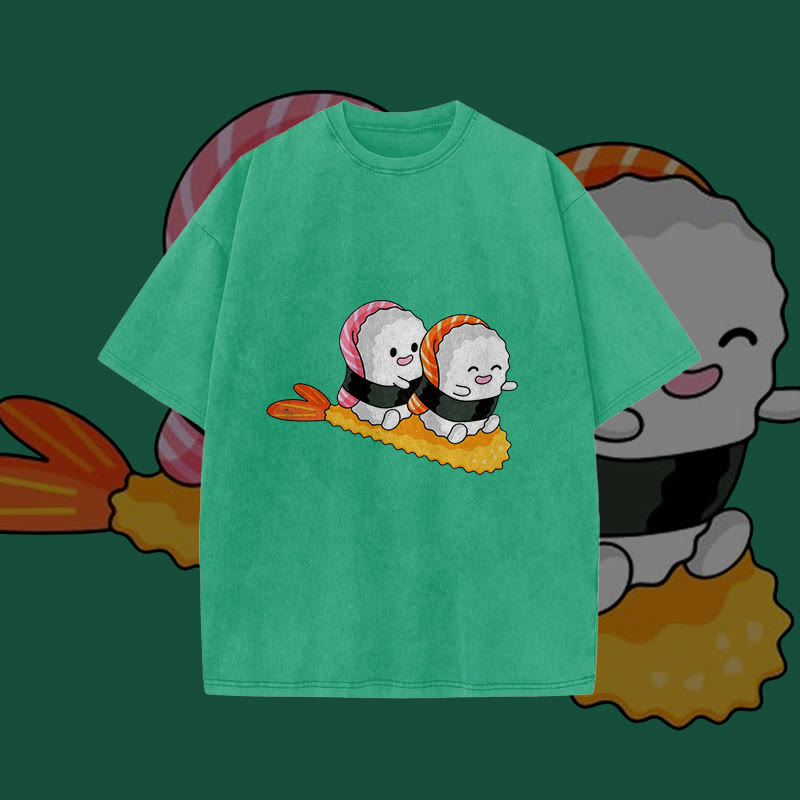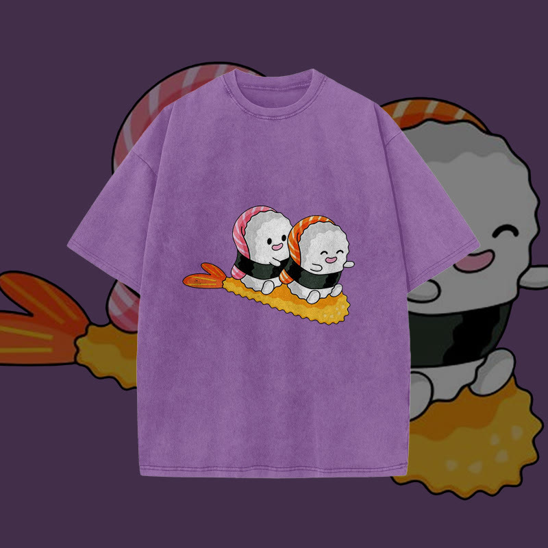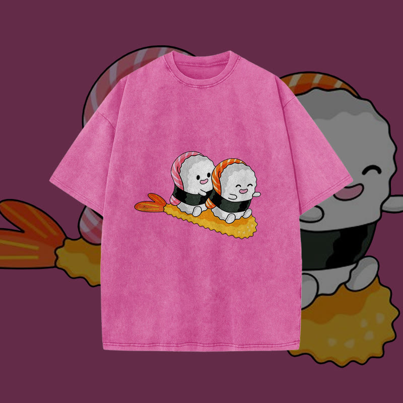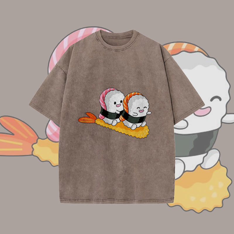 Unisex Cute Sushi Playing Print Acid Washed T-shirt