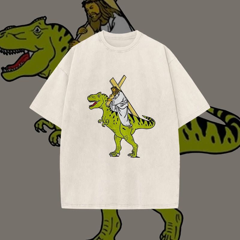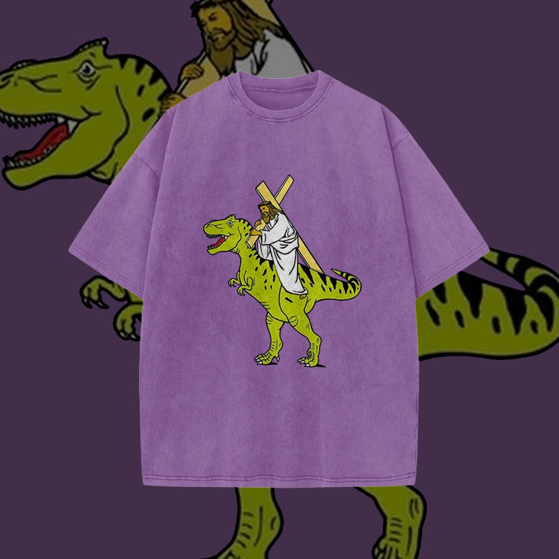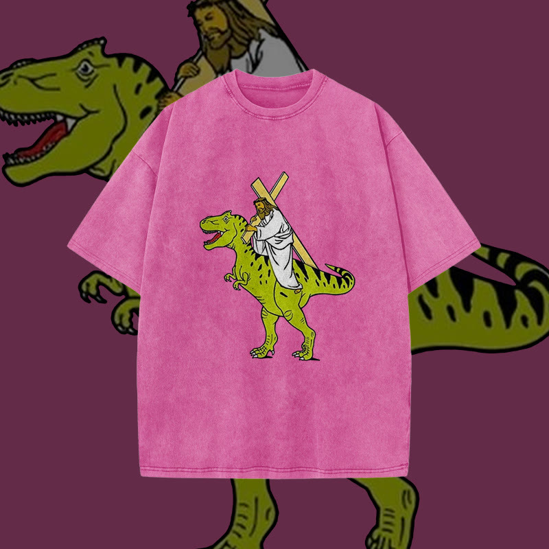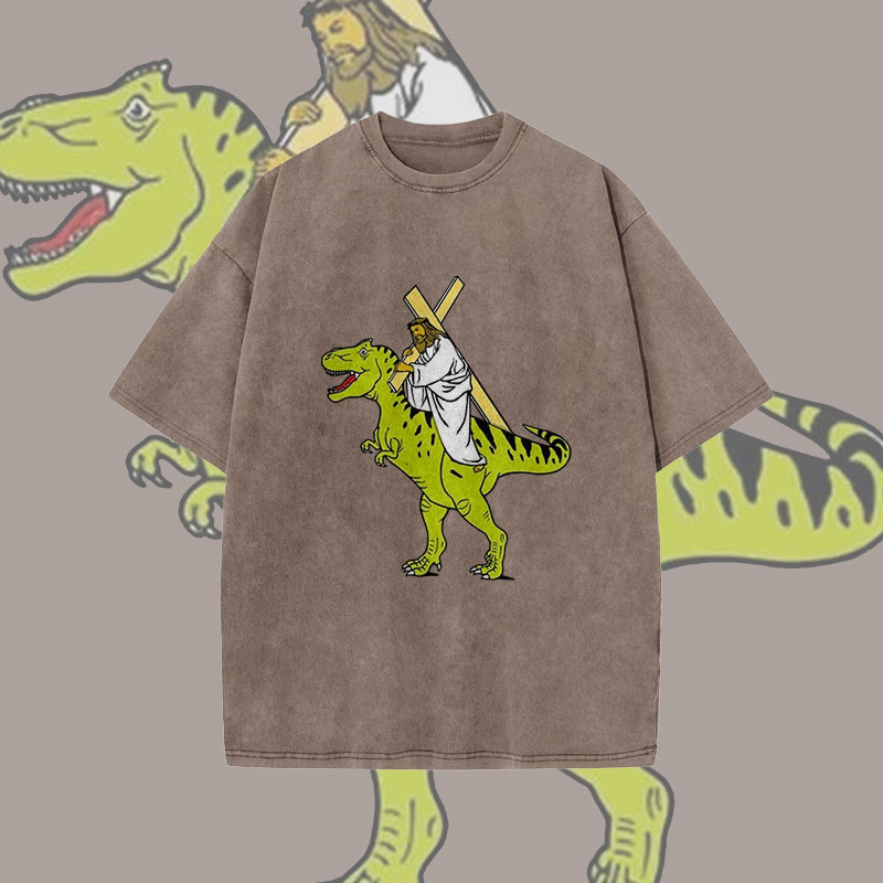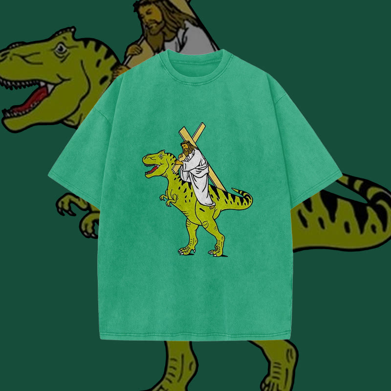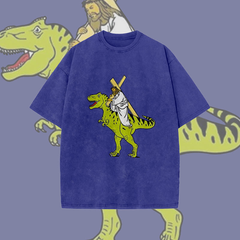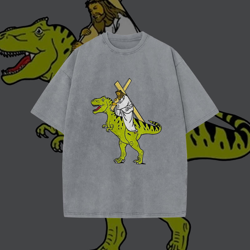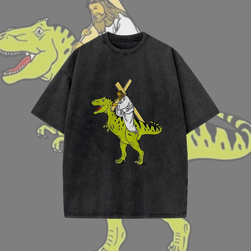 Unisex Dinosaur Carrying Jesus Print Acid Washed T-shirt