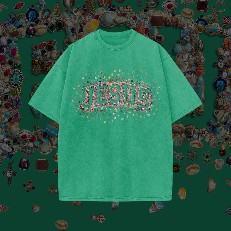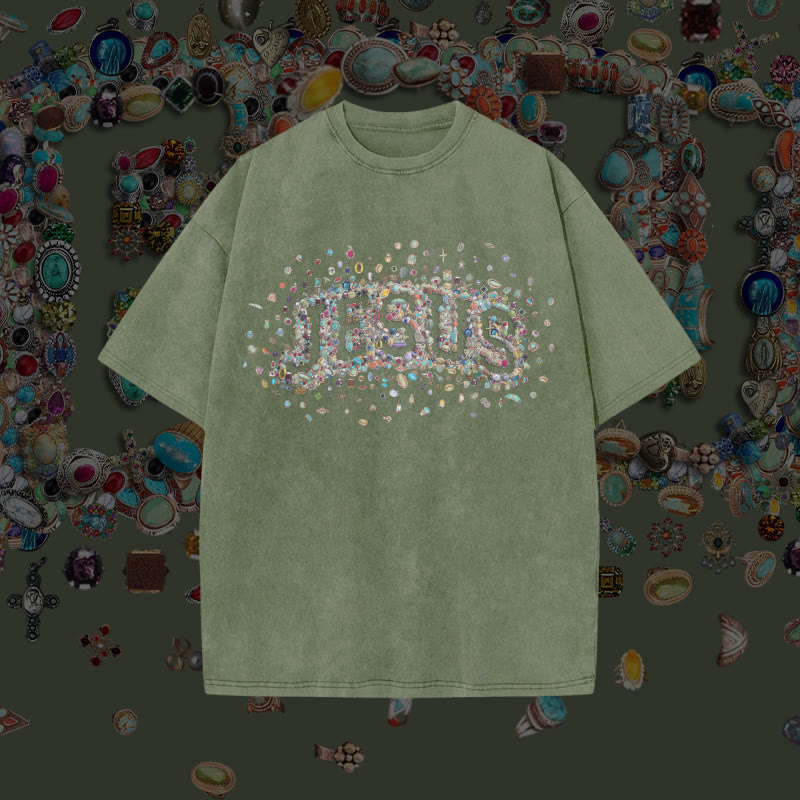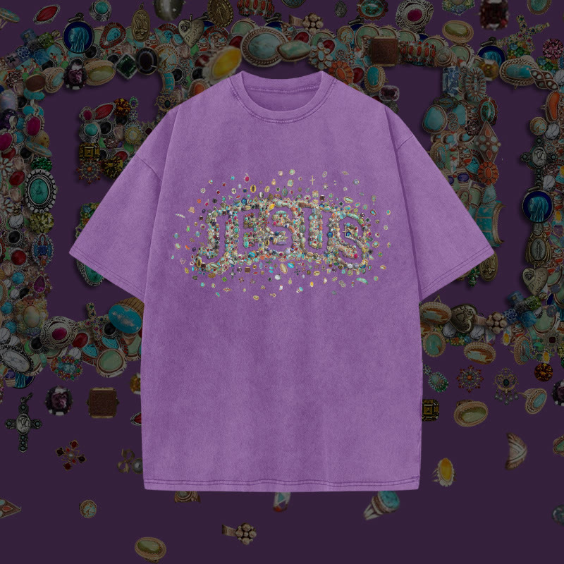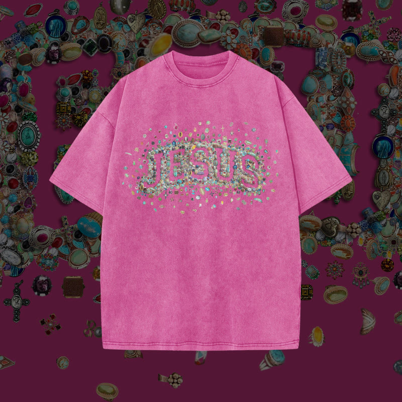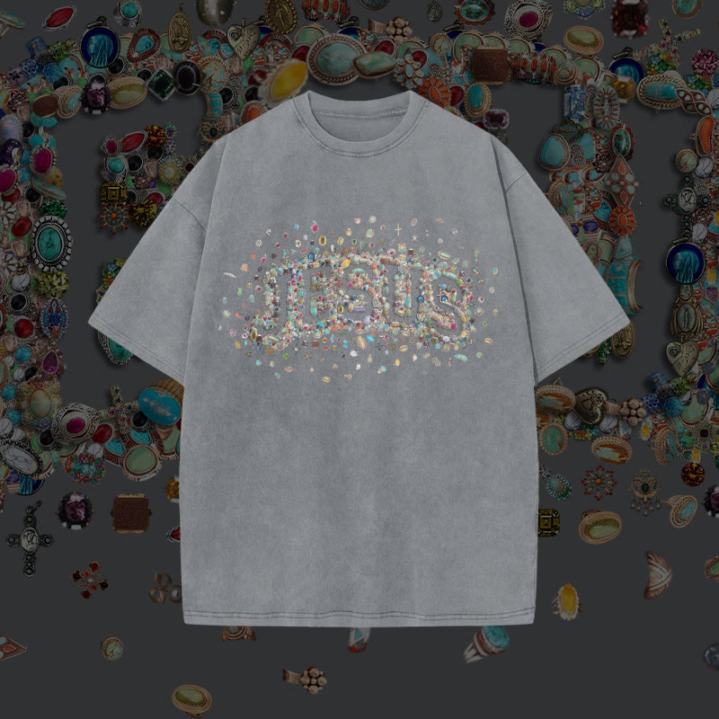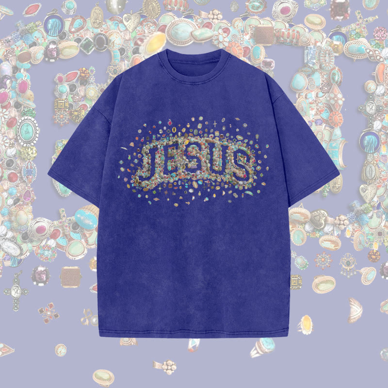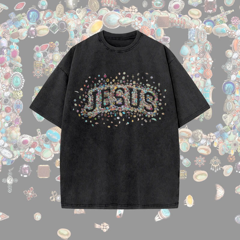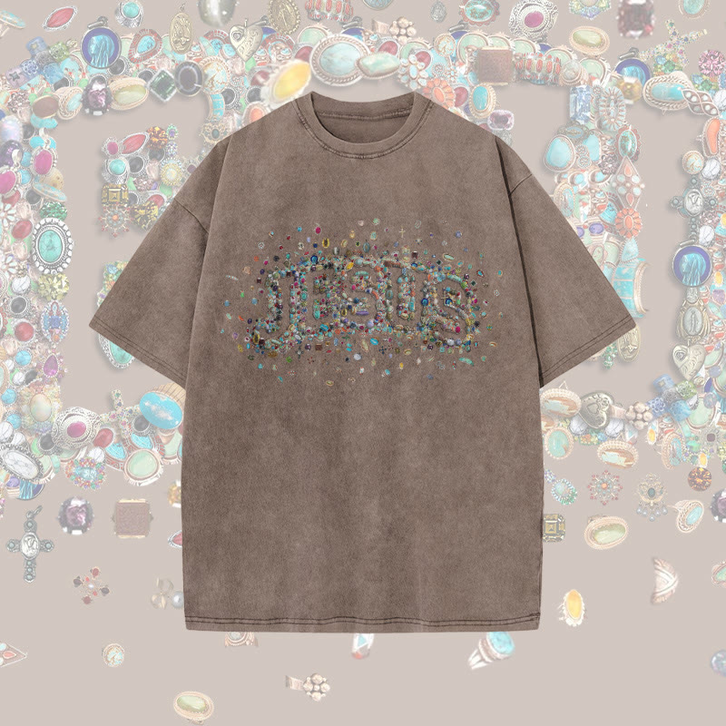 Unisex Gemstone Hollow Jesus Print Acid Washed T-shirt