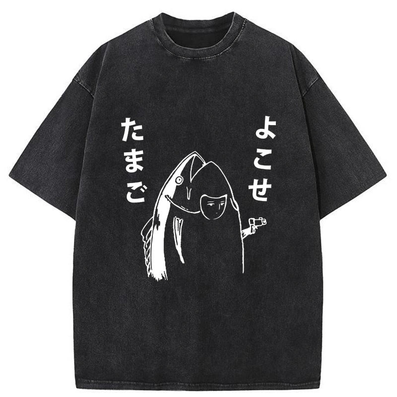 Unisex Give Me Egg Japanese Fish Print Acid Washed T-shirt