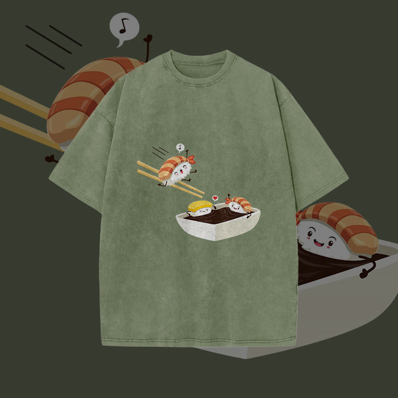 Unisex Happy Sushi In Soy Sauce Print Acid Washed T-shirt