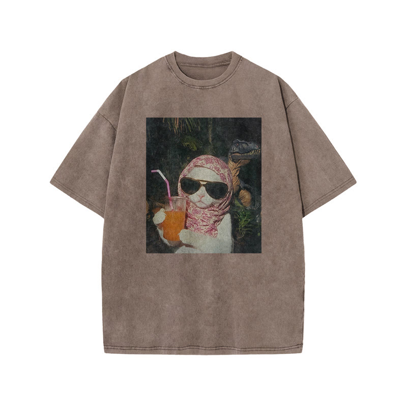 Unisex Holiday Cat Print Acid Washed T-shirt