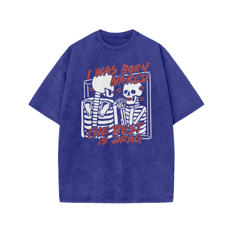 Unisex I Was Born Naked Print Acid Washed T-shirt