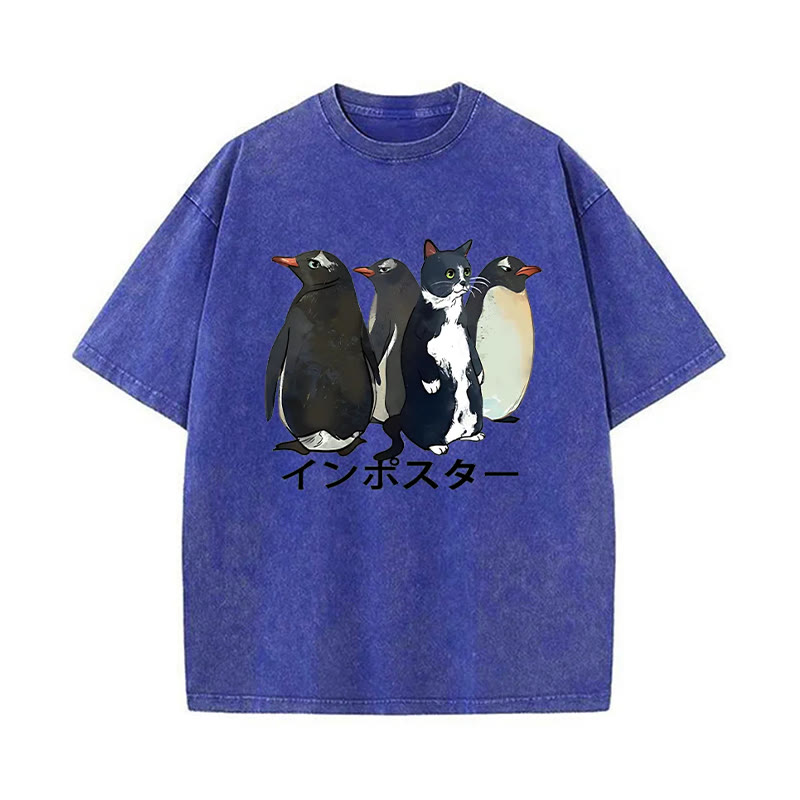 Unisex Imposter Among Penguins Print Acid Washed T-shirt