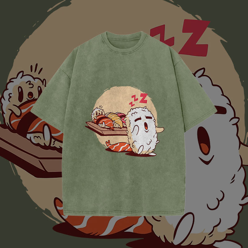 Unisex Japanese Cute Sleeping Sushi Print Acid Washed T-shirt
