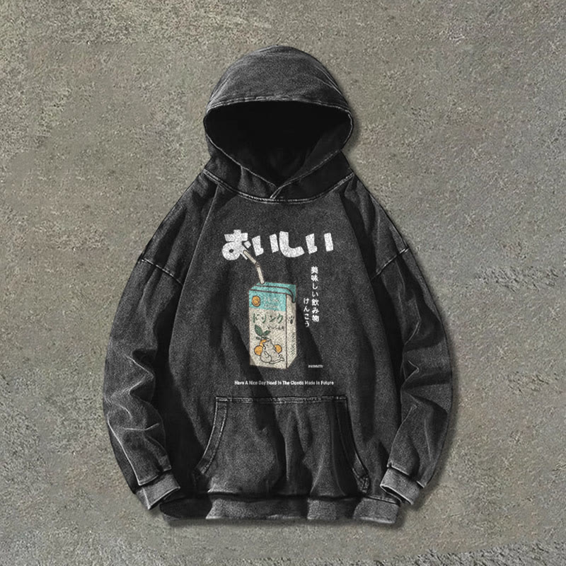 Unisex Japanese Drink Pattern Letter Printed Washed Hoodie
