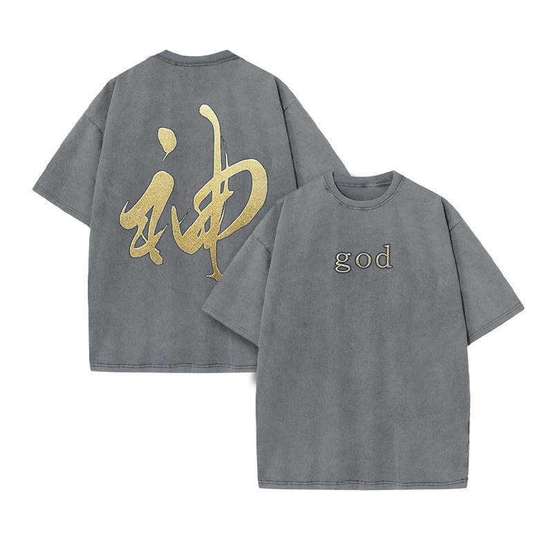 Unisex Japanese Kanji God Print Acid Washed T-shirt