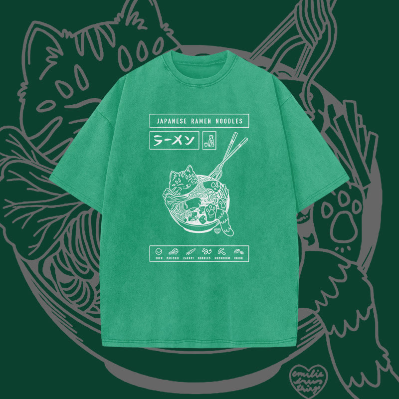Unisex Japanese Ramen Cat Print Acid Washed T-shirt