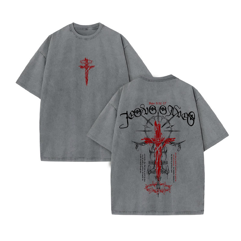 Unisex JESUS SAVES Print Acid Washed T-shirt