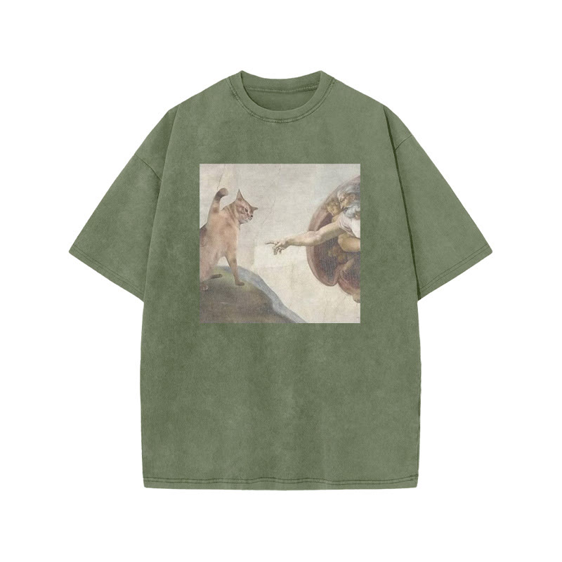 Unisex Oil Painting Cat Print Acid Washed T-shirt