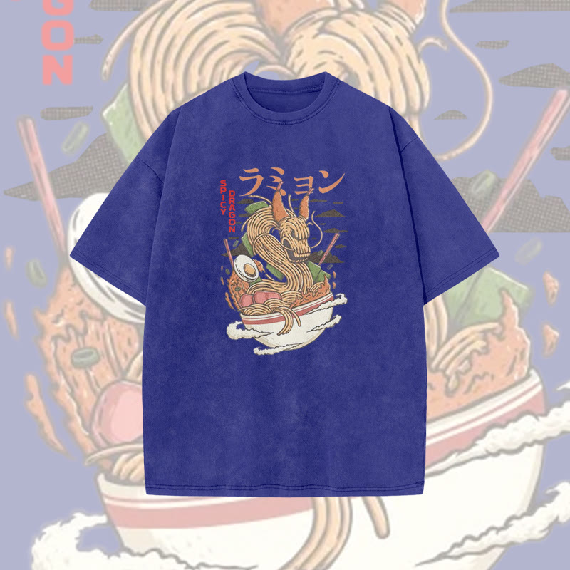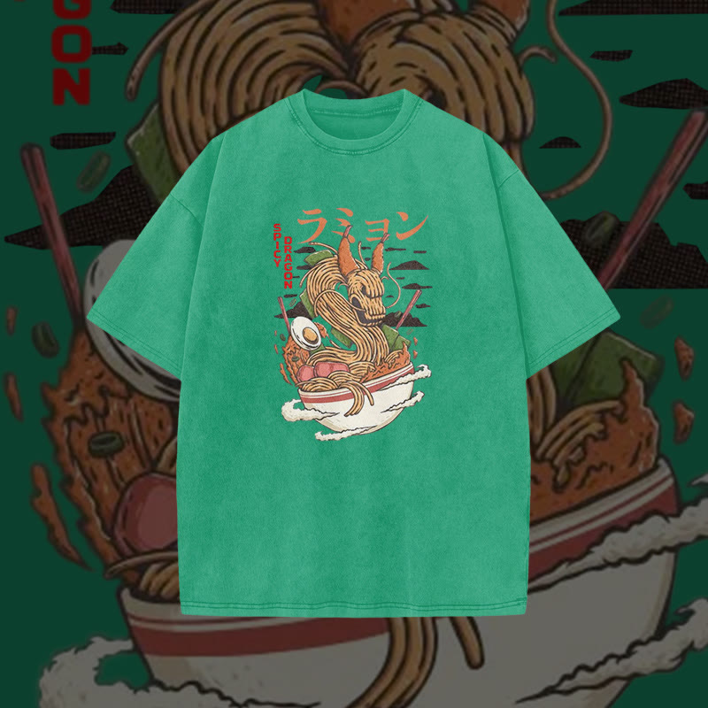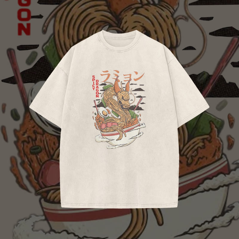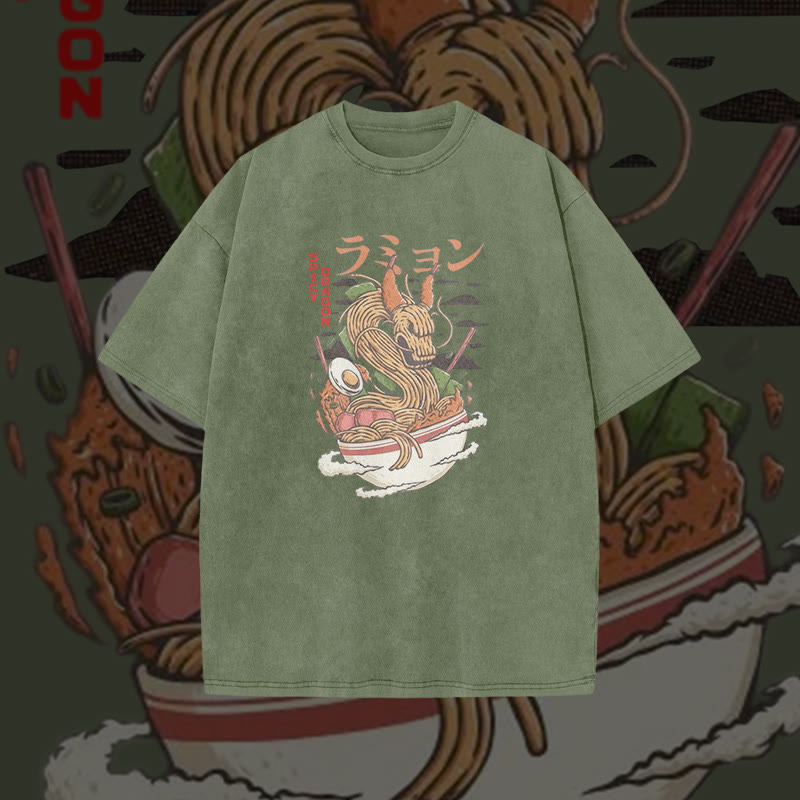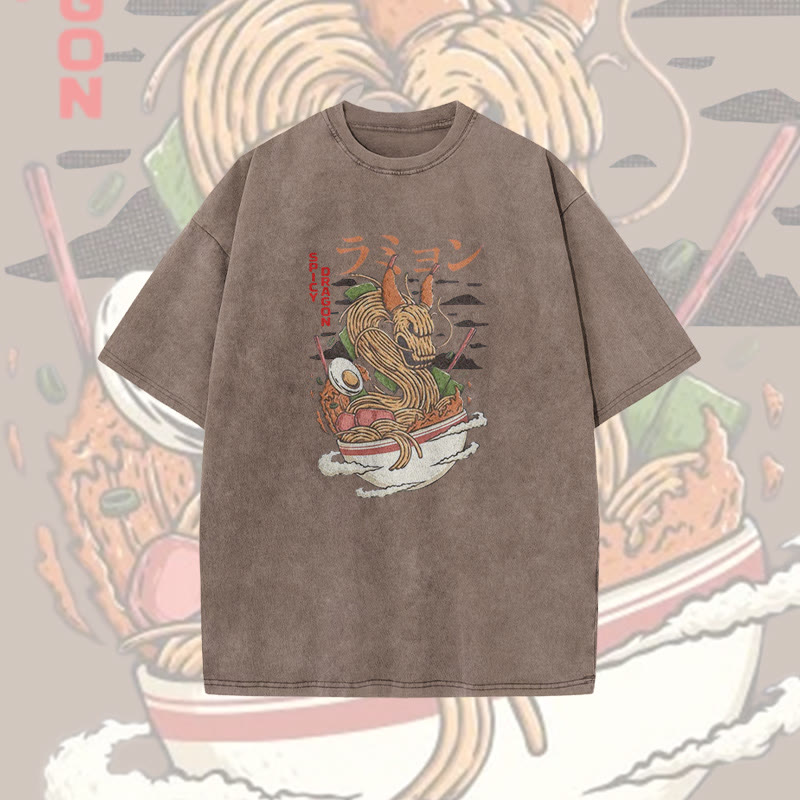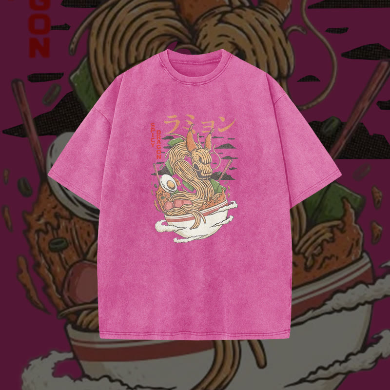 Unisex Ramen Dragon Monster Print Acid Washed T-shirt