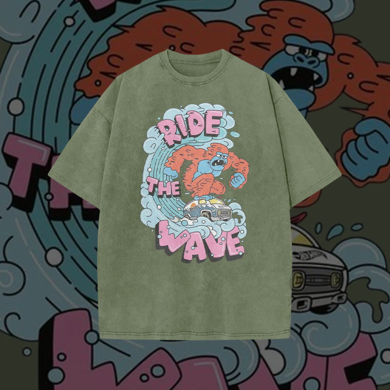 Unisex Ride The Wave Print Acid Washed T-shirt